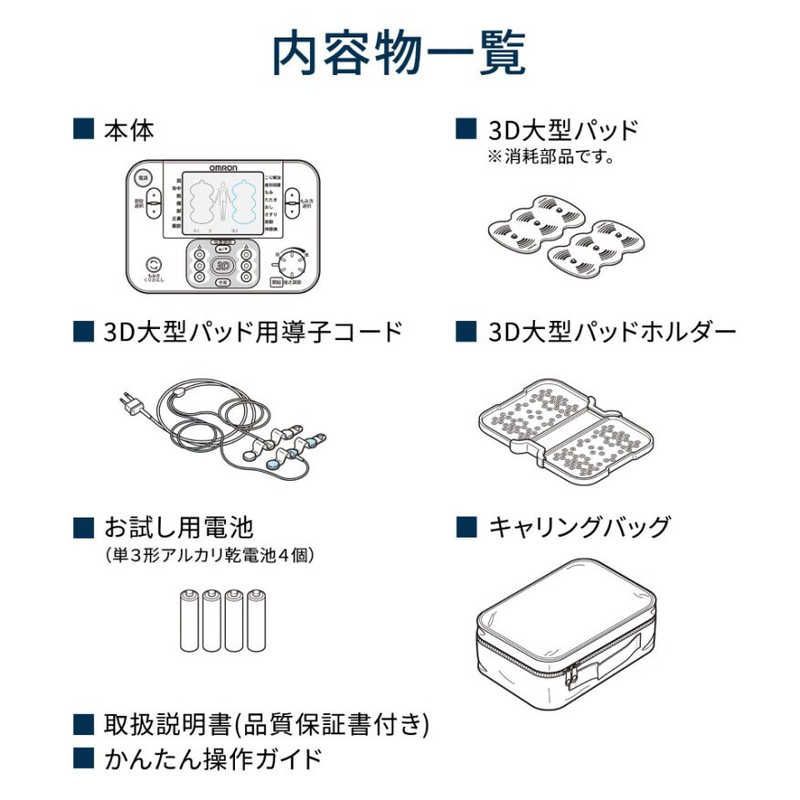 付属品:3D 大型パッド、3D 大型パッド用導子コード、3D 大型パッドホルダー、お試し用電池(単 3 形アルカリ乾電池 4 個)、キャリングバッグ、取扱説明書(本書:品質保証書付き)、かんたん操作ガイド