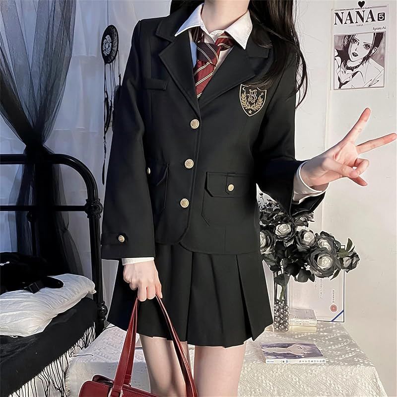QOOLY ブレザー 黒 女子高生 コスプレ 制服 4点セット プリーツスカート ネクタイ シャツ 学生服 女の子 高校生 コスチューム 仮装 フォーマルスーツ 女子制服 卒業式 入学式 XL 0