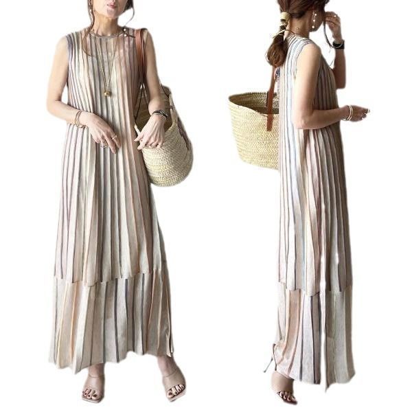 ワンピース 即 OK 夏 ストライプ ニット ノースリーブ クルーネック ジャカード KdJc 949