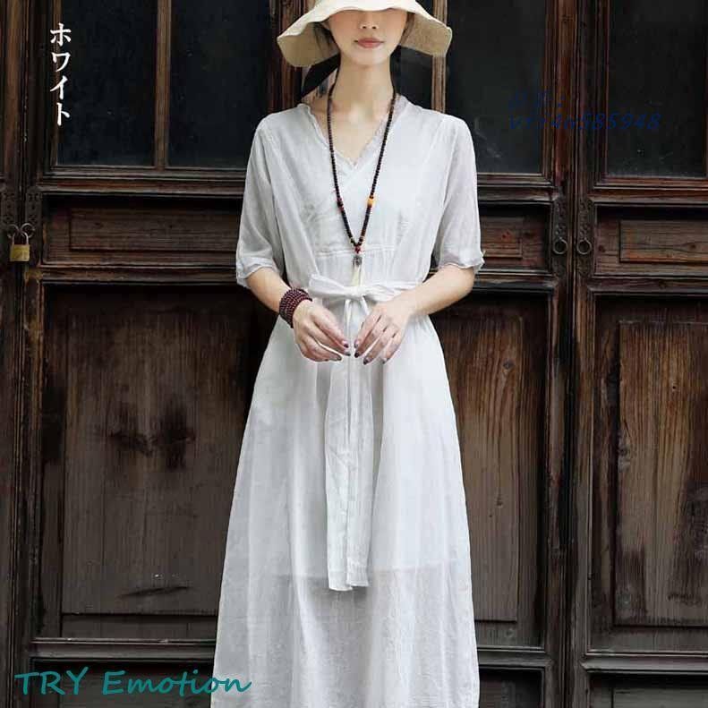 無地ホワイトワンピース 春夏 きれいめ ロングVネックレディース マキシ Aライン マリン風 麻綿混紡 ゆったりウエストベルト vii 4 w 585948