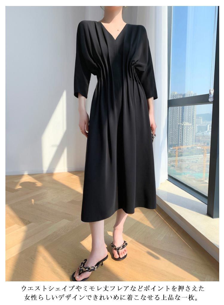 落ち感 レディース ドレス 春 7分袖丈 Vネック ロングワンピース タックワンピース ウエストシェイプ ハイウエスト ピンタック ワンピース Aライン ドルマンスリーブ gurug 573519