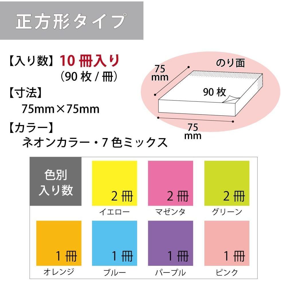 コクヨ 付箋 強粘着ふせん K 2 75 10冊 正方形タイプ ネオン ミックス 2メ
