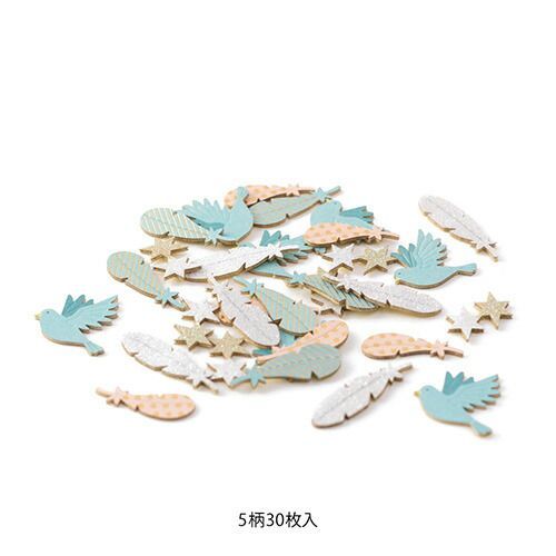 詳細情報カードや色紙、ラッピングのデコレーションに使えるフレークタイプのシール。金箔やラメをあしらい、散らして使うと羽が舞っているような使いやすいデザインです。