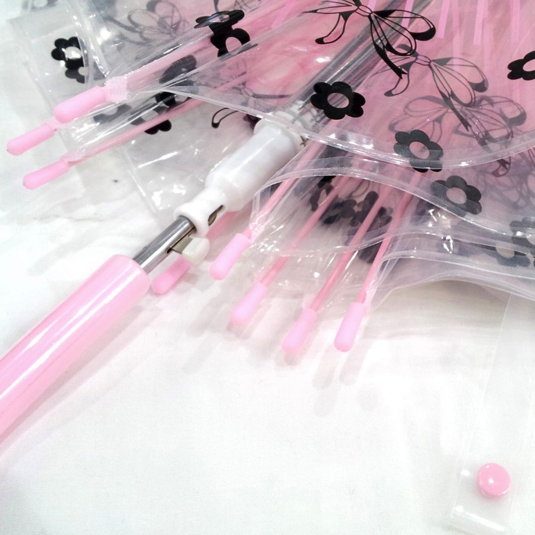クリアにピンクのストライプとリボンとお花がプリントされた、かわいいビニール傘。
