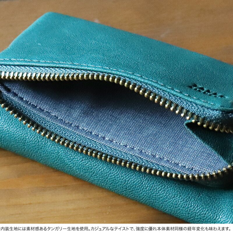 手に馴染み吸いつくような柔らかなタッチ感と革らしい味わいある表情が魅力のシープスキンを素材に使用。鞣し段階でオイルを浸透させているので、柔らかなタッチ感にプラスされるしっとりとした風合いも魅力。革特有の経年変化も楽しめます。縫製は素材感を活かした袋縫いを採用し、手に馴染む風合いがより堪能出来ます。ファスナーやメタル類は本体素材同様の味わい深く、クラシックなテイストの真鍮カラーを使用しTAKEO KIKUCHIらしさを演出。内装生地には素材感あるタンガリー生地を使用。カジュアルなテイストで、強度に優れ本体素材同様の経年変化も味わえます。キーフックは5連。外側のファスナーポケットは小銭やスマートキーの収納が可能。内装にはカードポケットも装備しており、使い 勝手の良い作り。ブランドボックス付きなので贈り物にも最適です。
